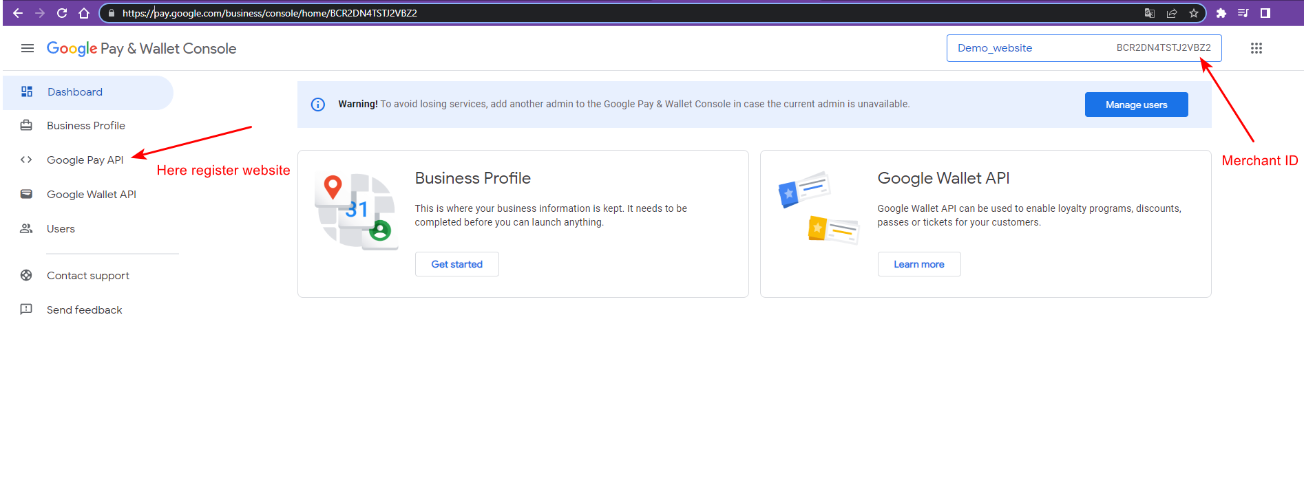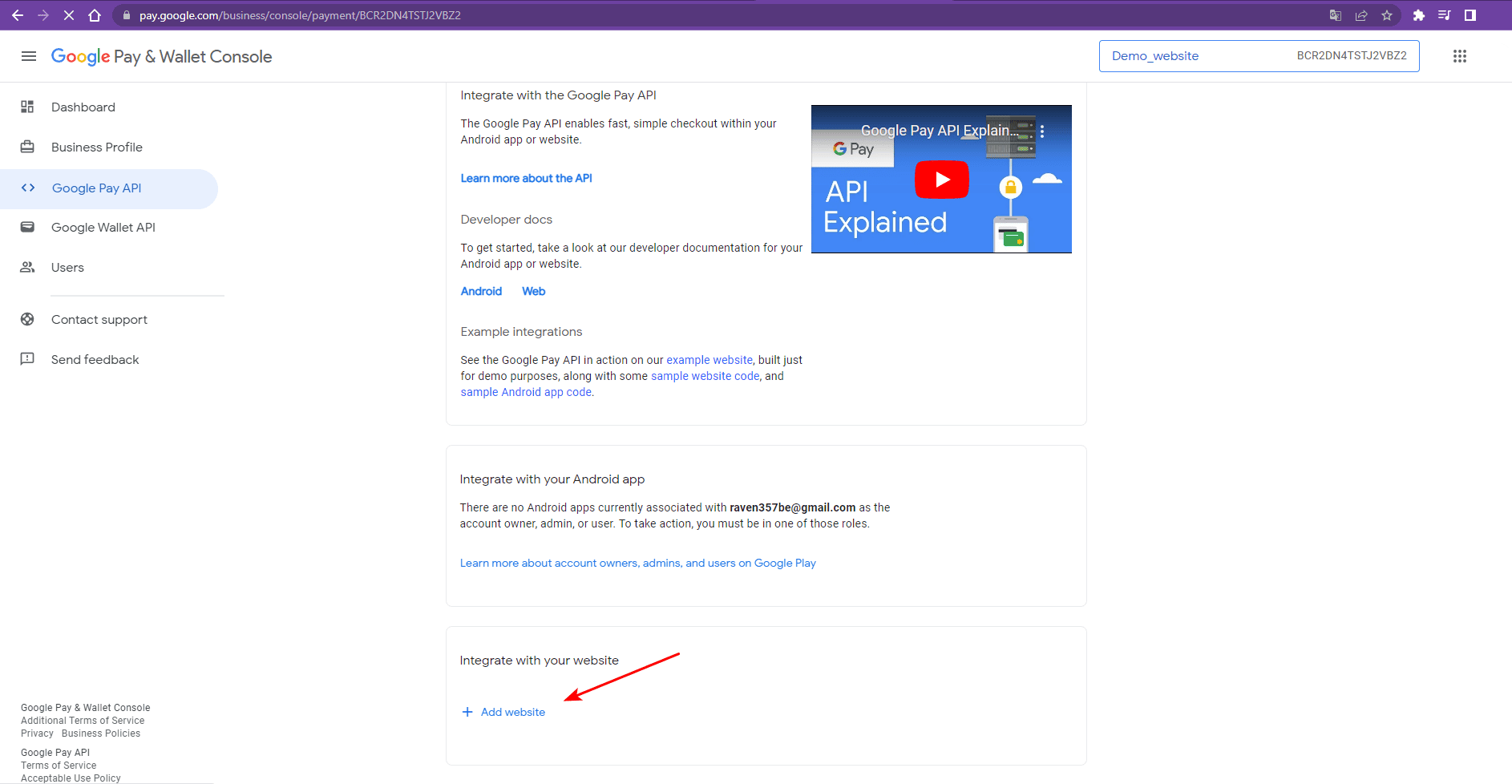 Then, from the account screen in the console, save the Merchant ID and proceed to the registration of the website in the Google Pay API section.