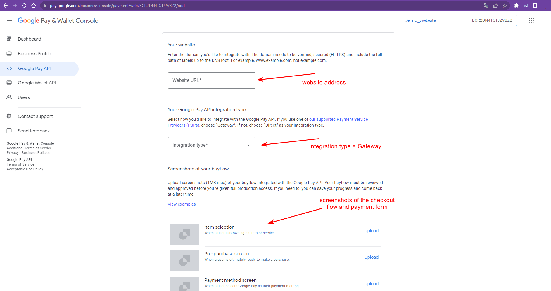 Specify screenshots of the checkout and payment form in the website settings, as well as integration type = Gateway and the address of the Connecting Party’s website from where the purchase starts.