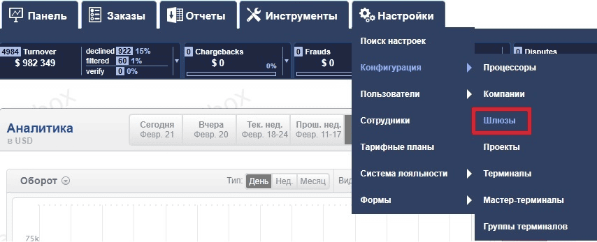 Для автоматического закрытия дня менеджеру или его сотруднику в личном кабинете системы надо перейти в настройки шлюза, для которого требуется закрывать день автоматически.