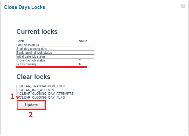 После выполнения команды сброса, повторно откройте инструмент снятия блокировки и проверьте, что в меню «Current locks» изменился статус сбрасываемого параметра. Например, если шлюз был заблокирован, то после снятия блокировки параметр «Is day closing» = N.