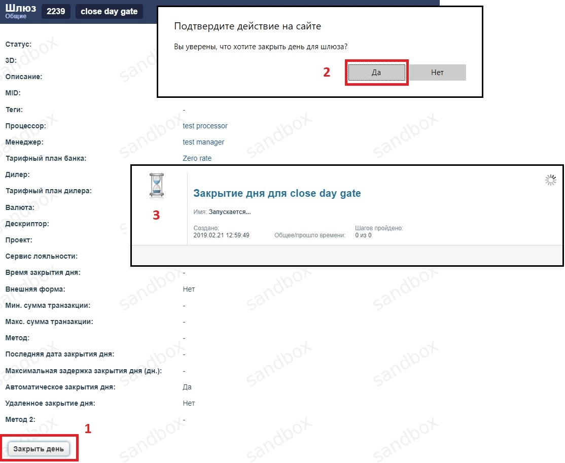 На странице шлюза нажмите кнопку «Закрыть день» и подтвердите закрытие дня на всплывающем окне. На странице начнет отображаться окно «Закрытие дня для „имя шлюза“», дождитесь завершения операции.