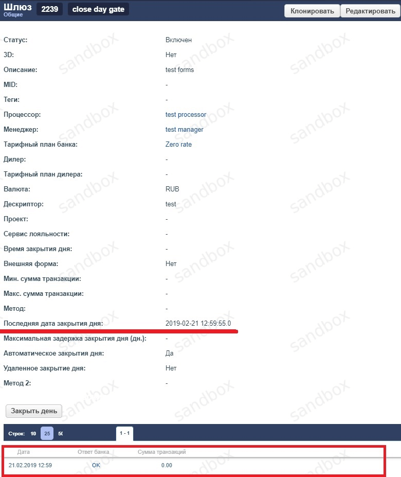 Закрытие дня будет выполняться в заданное время, после успешного закрытия дня на странице шлюза будет отображена информация о дате закрытия и сумме транзакций с момента последнего закрытия дня для данного шлюза до текущего закрытия дня.