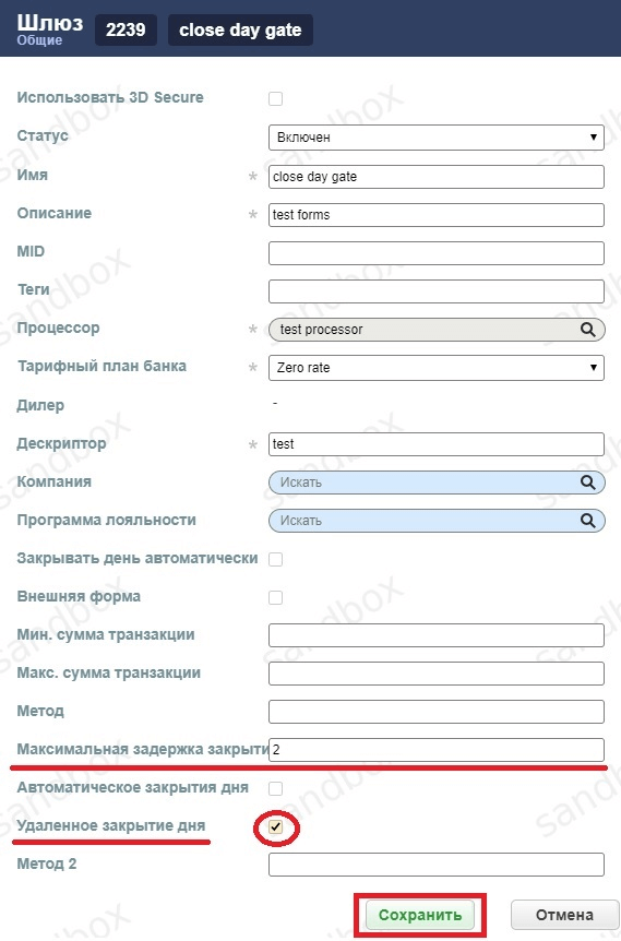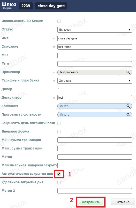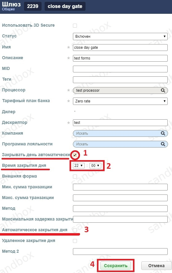 На странице шлюза нажмите кнопку «Редактировать», поставьте галочку напротив пункта «Автоматическое закрытия дня» и нажмите «Сохранить».