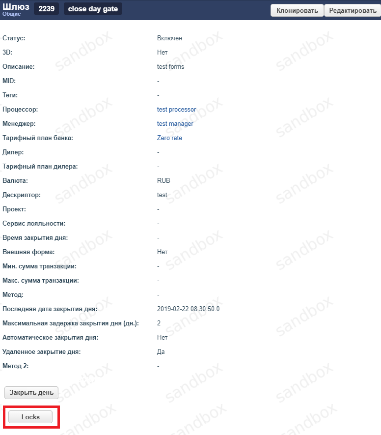 Если во время удаленного закрытия дня шлюз(ы) останутся в заблокированном состоянии (в теле ответа при «status»: «finished» для шлюза - «isDayClosing»: true), воспользуйтесь инструментом снятия блокировки в личном кабинете системы, который описан далее в этом разделе.