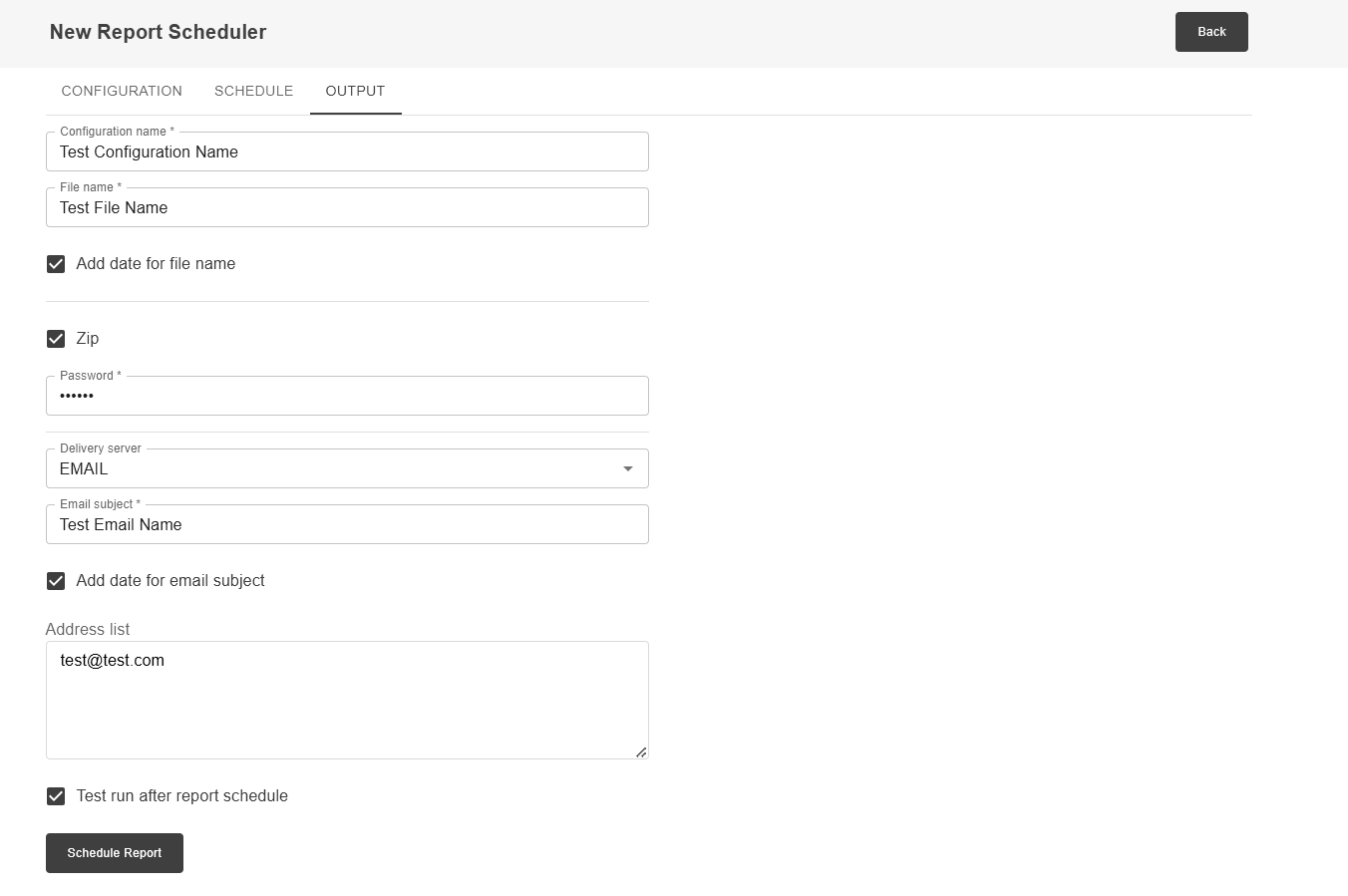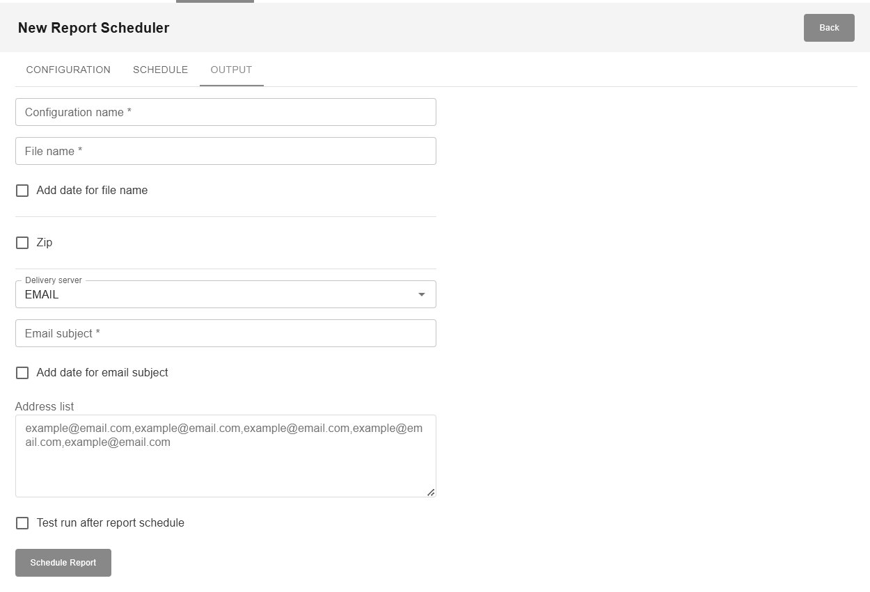 Address list - Email(s) to which the report will be sent. Multiple emails can be specified.