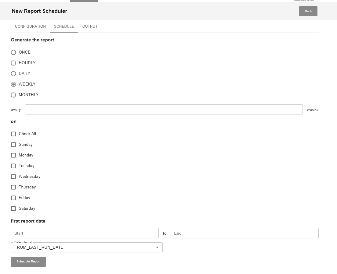 Weekly - By selecting this option, the report will be received every N weeks. It is possible to select a specific day, multiple days, or all days of the week.