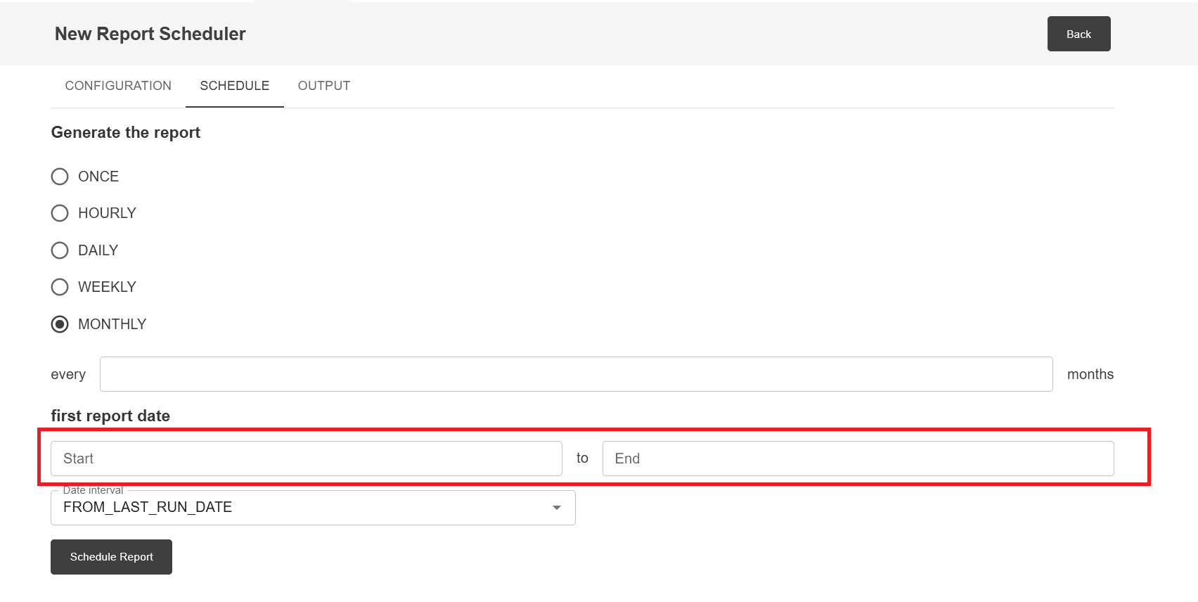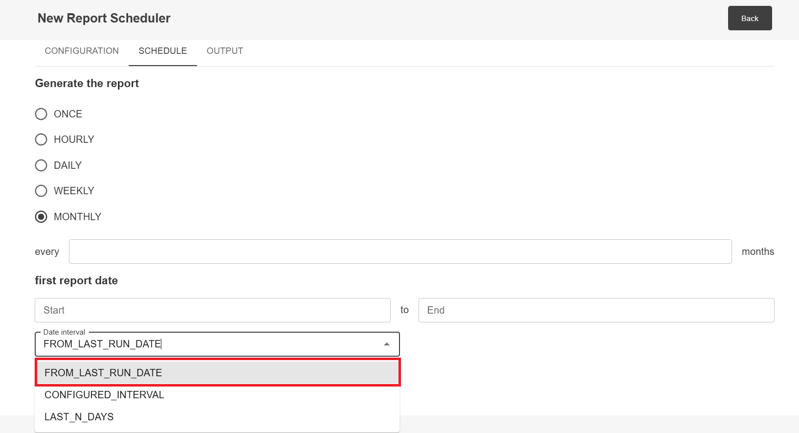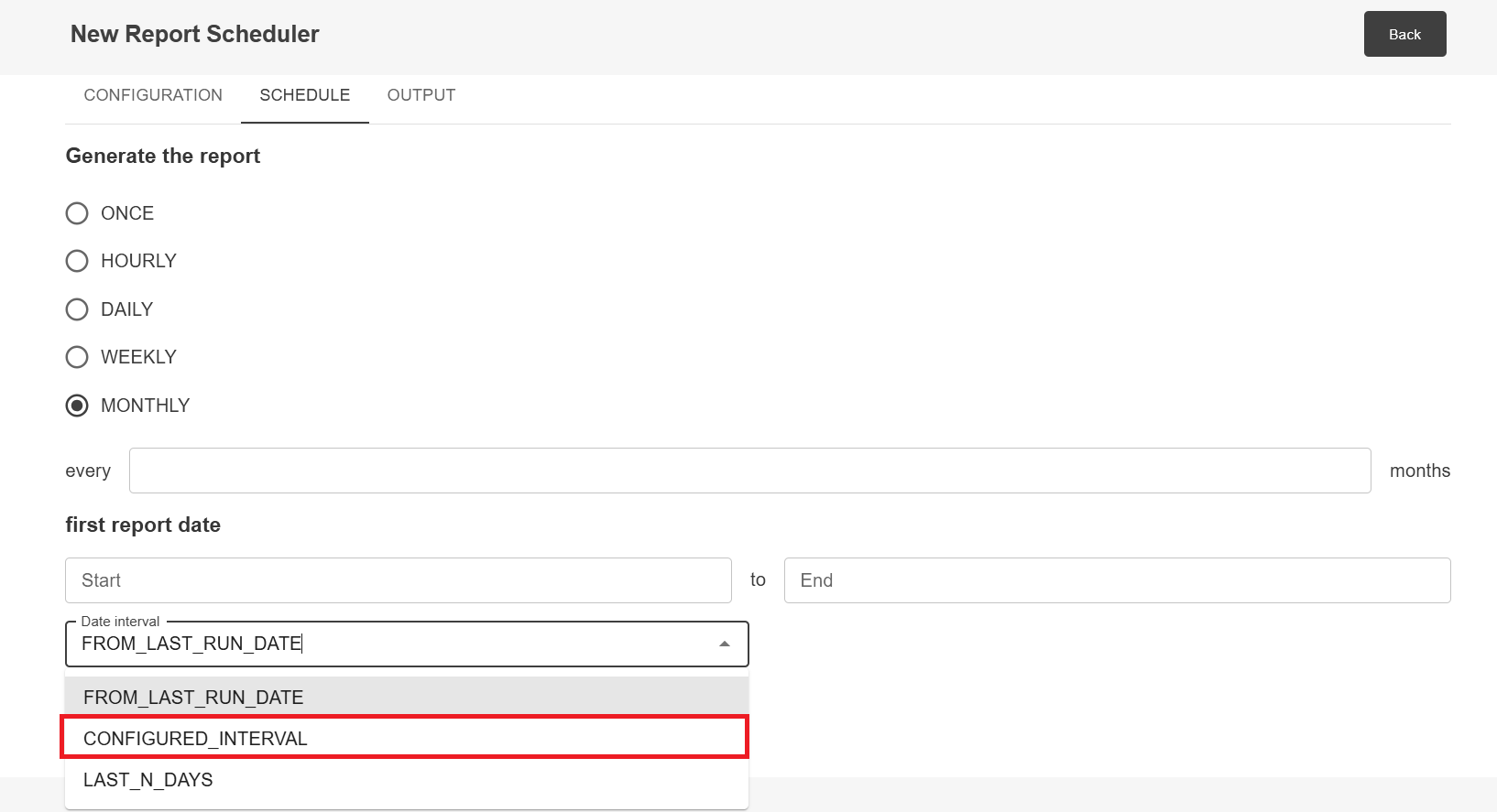 CONFIGURED_INTERVAL - On each subsequent run, the report will contain data shifted from the initially set dates schedule.