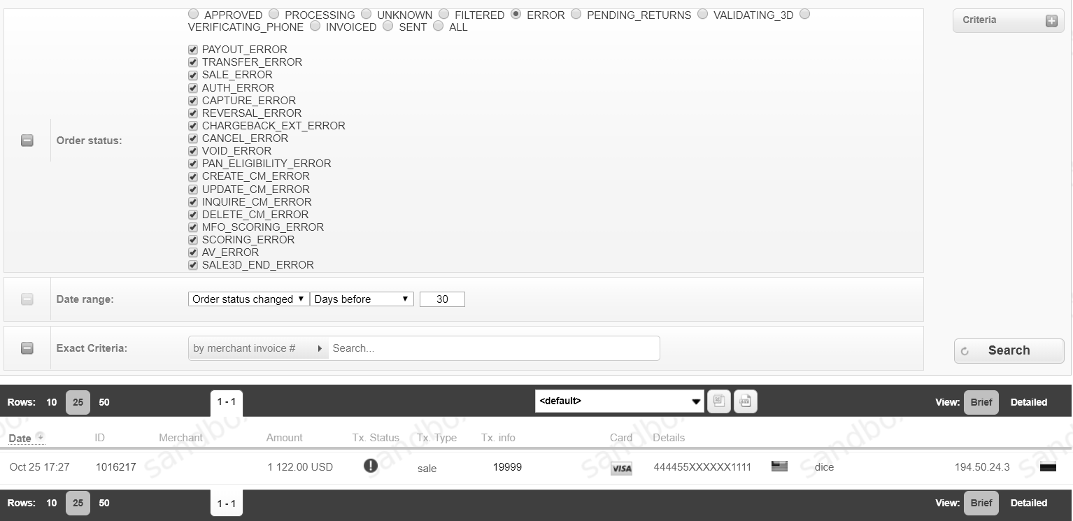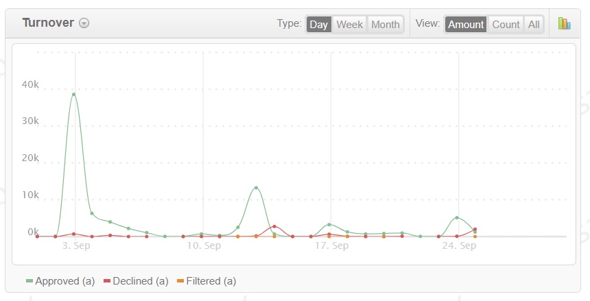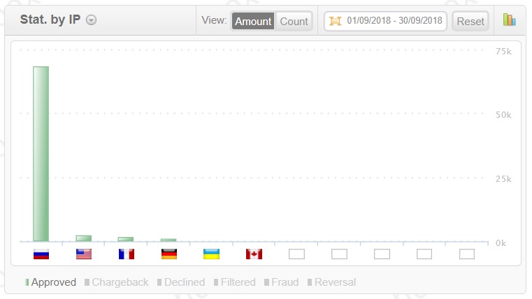 button: the ratio by volume of transactions or by amount of payments, as well as by type of transactions (sale, capture, transfer, etc). Doc2.0 Payment Gateway also displays statistics on negative activity and earnings.