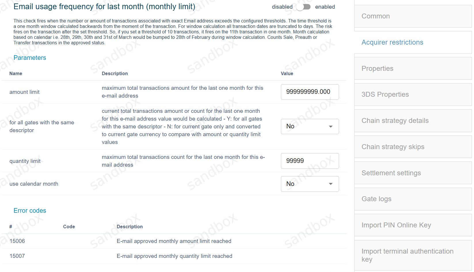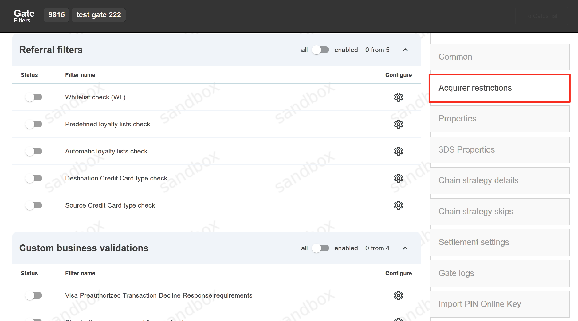 This functionality allows to set internal filters and prevent non-successful processing of transactions on gates which have specific limitations. To switch these limitations on, go to the required gate and click on the «Acquirer restrictions» tab.
