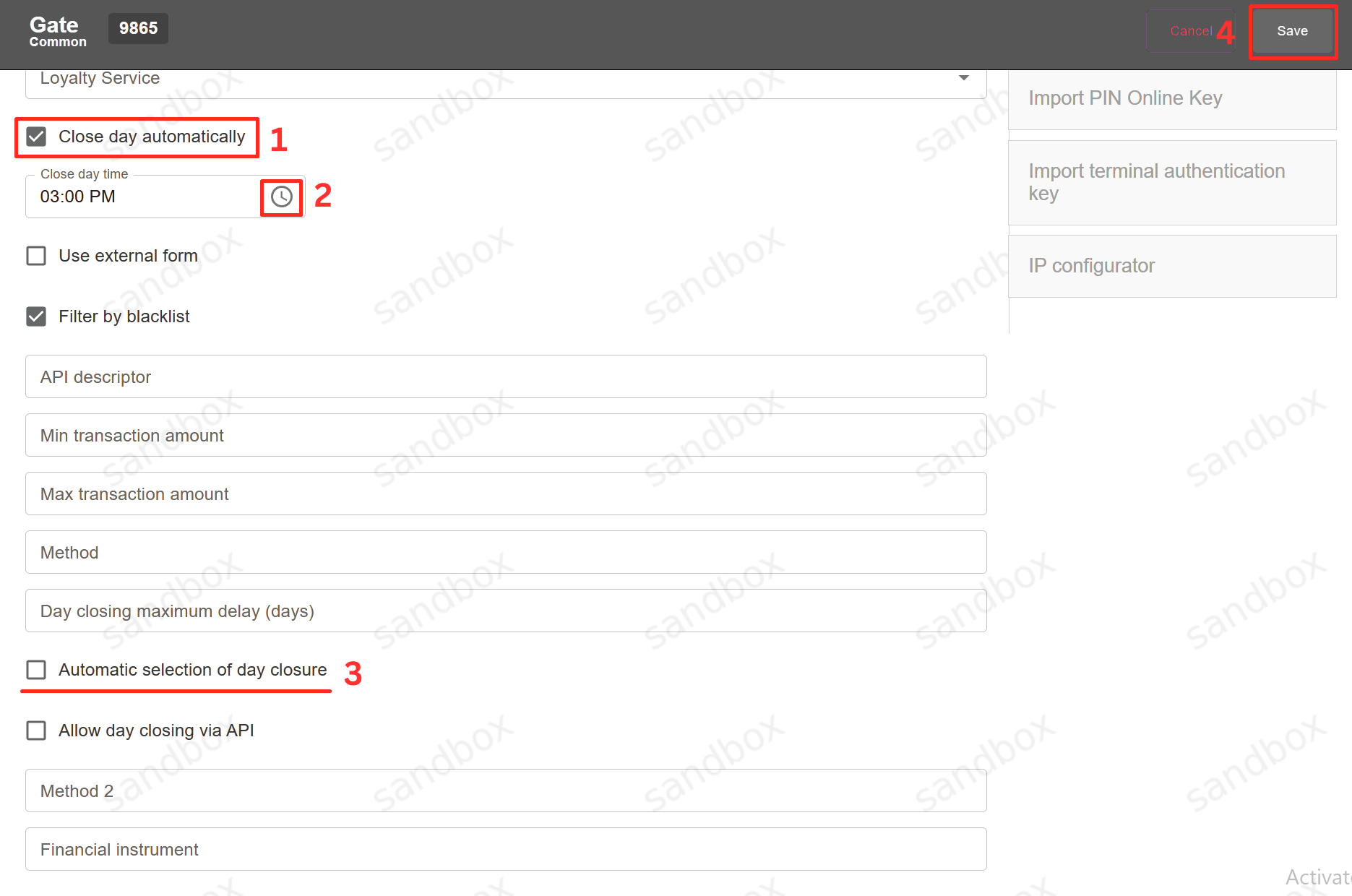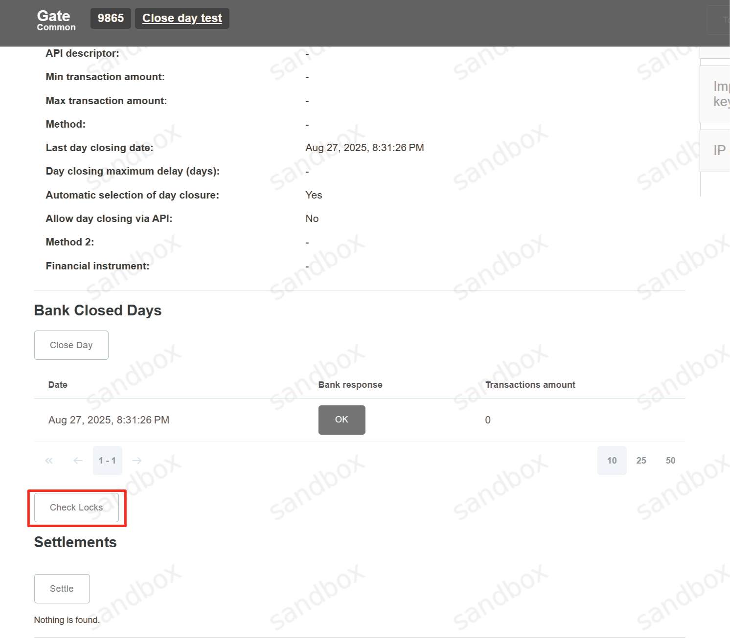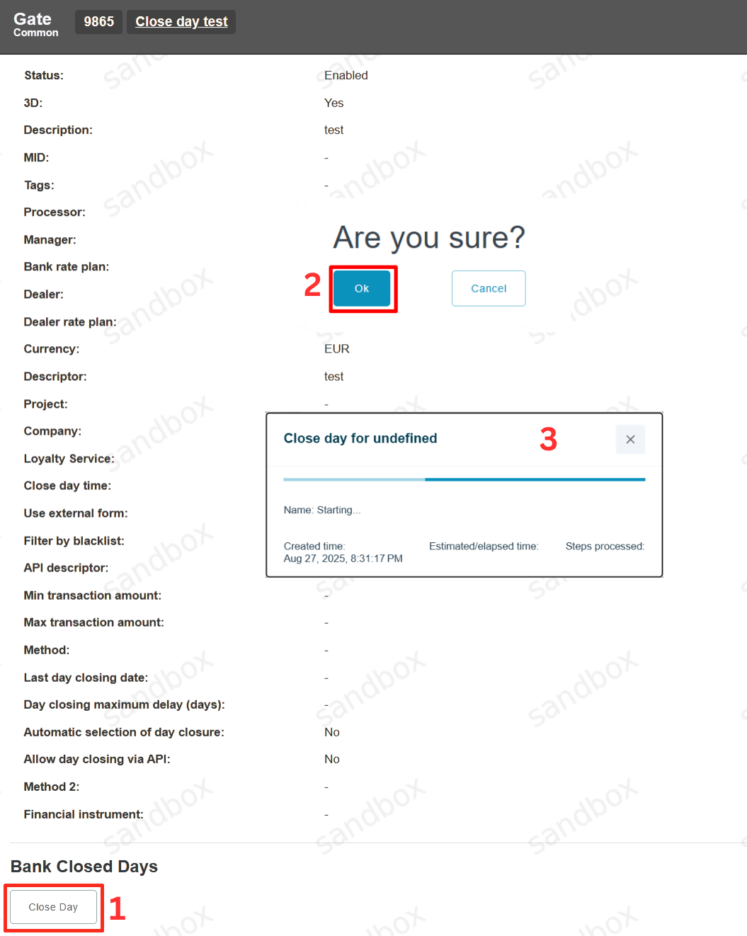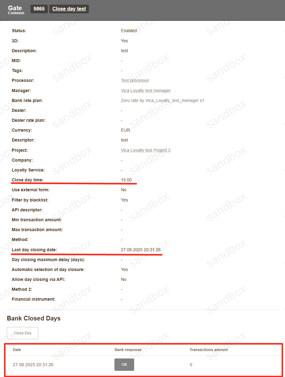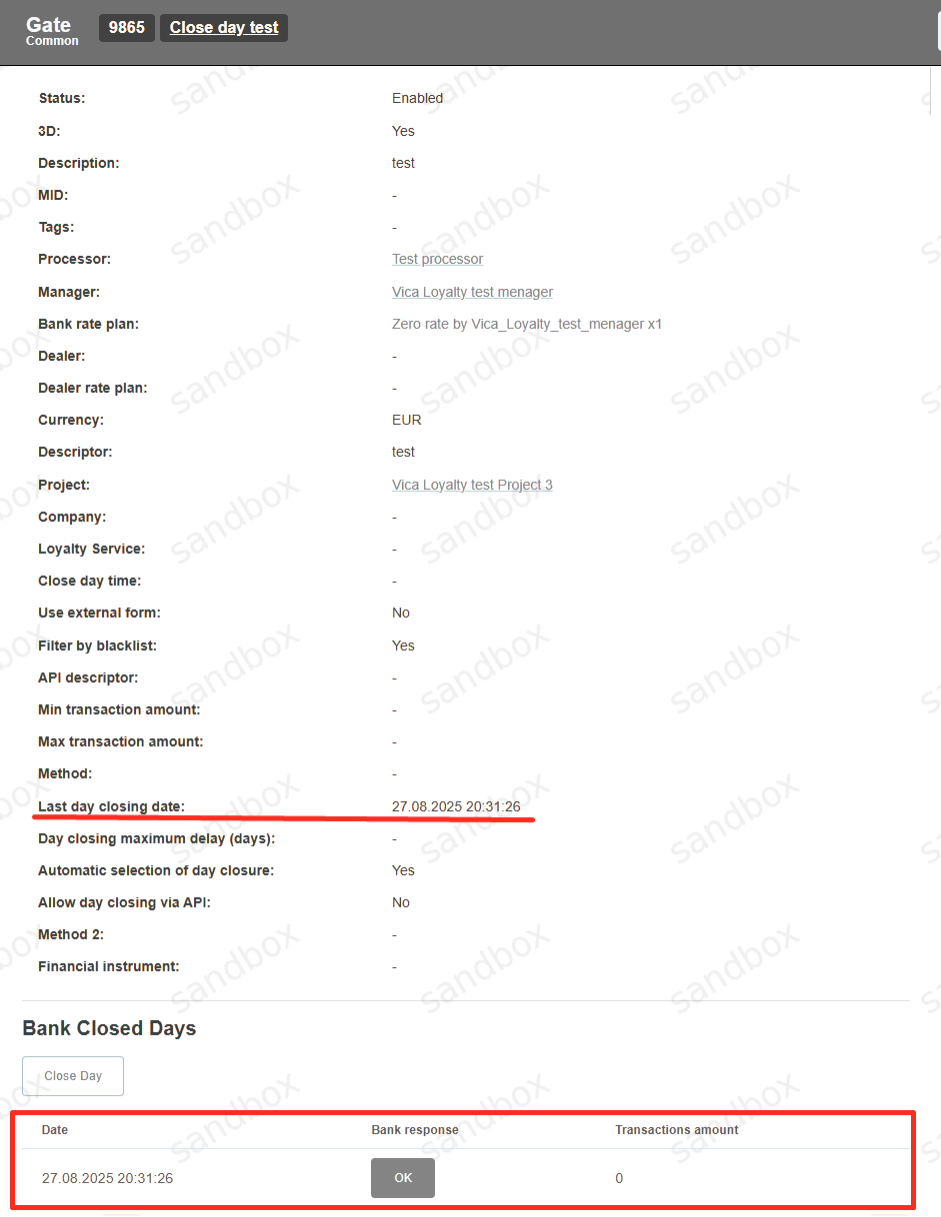 Close Day procedure can be initiated via API, manually with «Close Day» button on the Gate level, or automatically each day at pre-set or system selected time. If for any reason it is not possible to make «Close Day» using via API, then it is necessary to perform «Close Day» procedure manually on the Gate level.