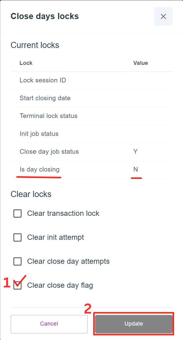 After the unlock, re-open the Gate Lock Release Tool and check that the status of the lock parameter has changed in the “Current locks” menu. For example, if the Gate was blocked, then after removing the lock, the parameter equals to Is day closing = N.