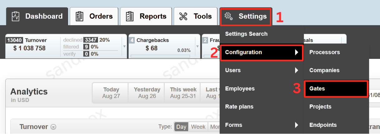 If during the gate closure via API one or more Gates remained blocked (in the body of the response with status: finished for Gate - isDayClosing : true), then removal of the lock can be done manually. In order to make this procedure go to Settings -> Configuration -> Gates: