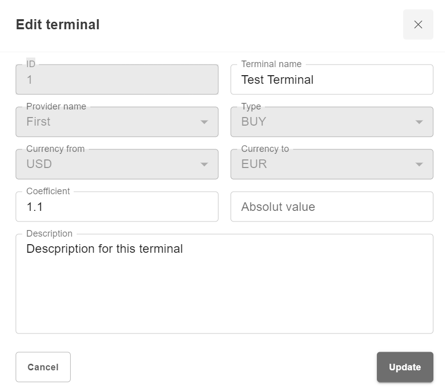 To create a new Terminal for Provider, click the «+ Add terminal» button. New window with parameters will appear as shown below: