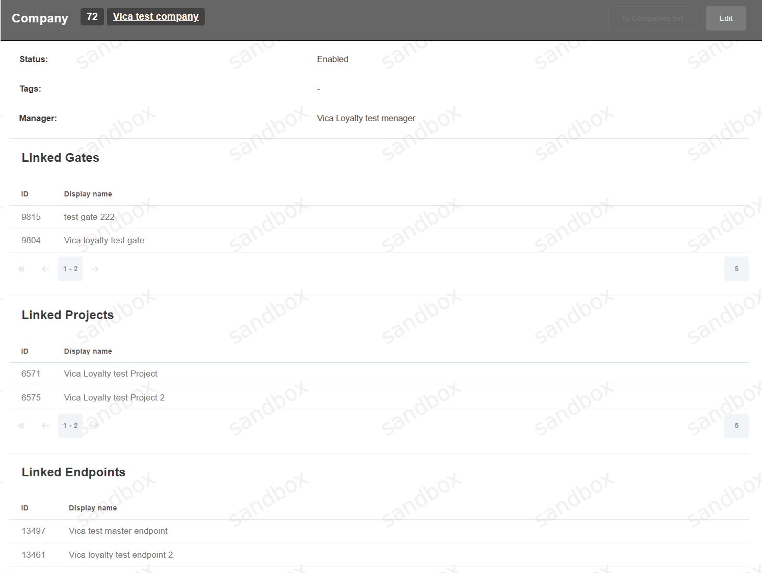 System entity which allows to combine several Gates in one entity, which can later be used in many system modules (for example limits, reports, etc.), which will simplify the work flow. Projects, Endpoints and Merchants will be added automatically, but only for information purposes. The Company list screen is located at Settings -> Configuration -> Companies.