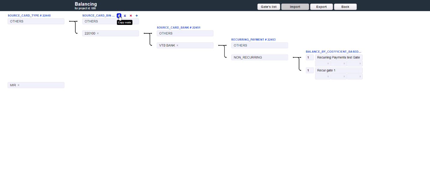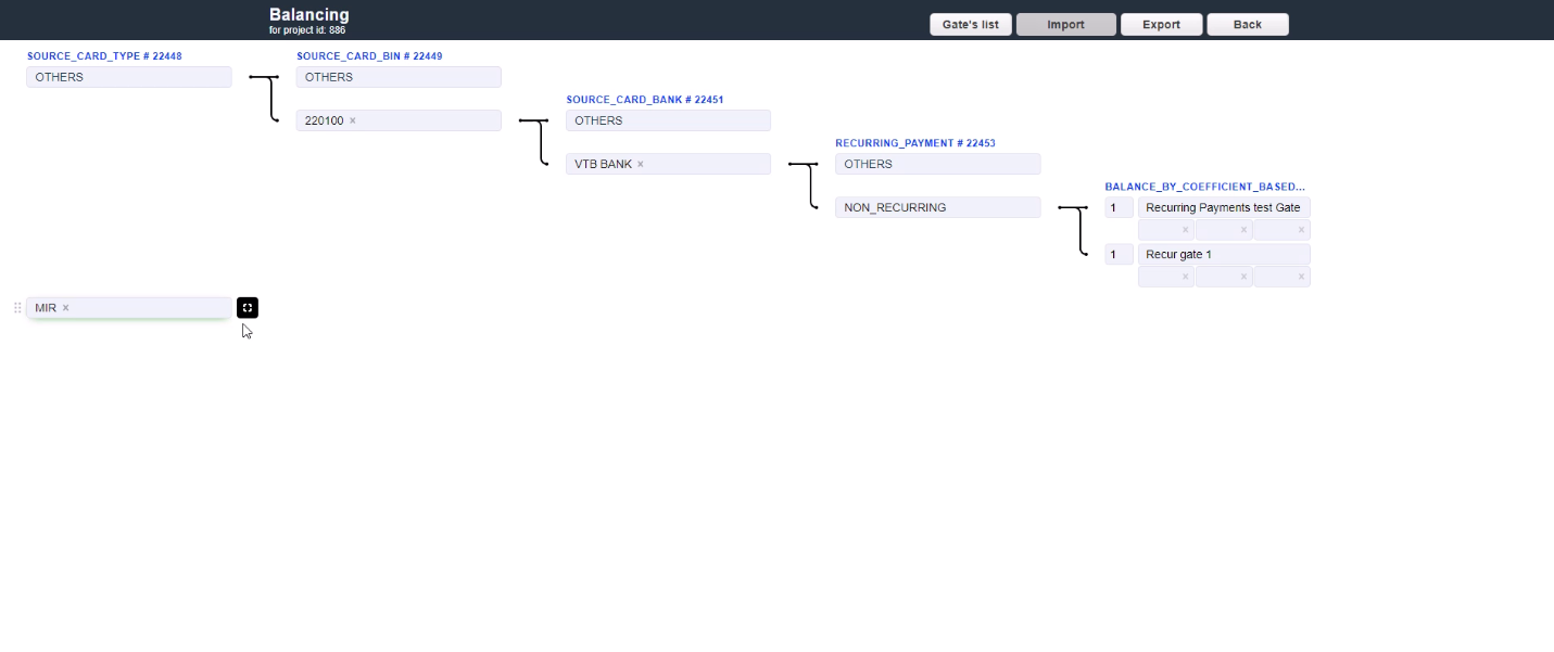 For example, 3 gates have 20%, 30% and 50% coefficients set for them. In this case, the gate with 50% coefficient has the 50% probability of becoming the first gate in the formed chain. If for some reason the first gate in chain was unable to process the transaction, it goes to the next gate in chain. If the second gate was not able to process the transaction as well, it moves on until one of the subsequent gates in chain processes it. The traffic will try to reach the distribution between the gates according to their coefficients based on the quantity of transactions.