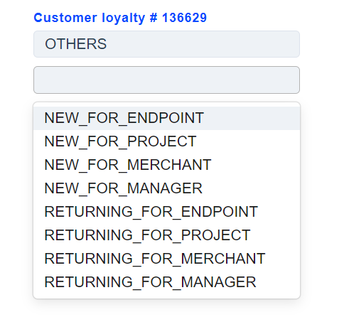 Customer Loyalty routing type is divided into endpoint, project, merchant, manager. Each of these levels has a Returning customer approve sessions count field that can be set for Managers by users with Superior role, while for Projects, Endpoints and Merchants - by users with Manager role. This value sets the number of transactions after which the customer will be considered “RETURNING”.