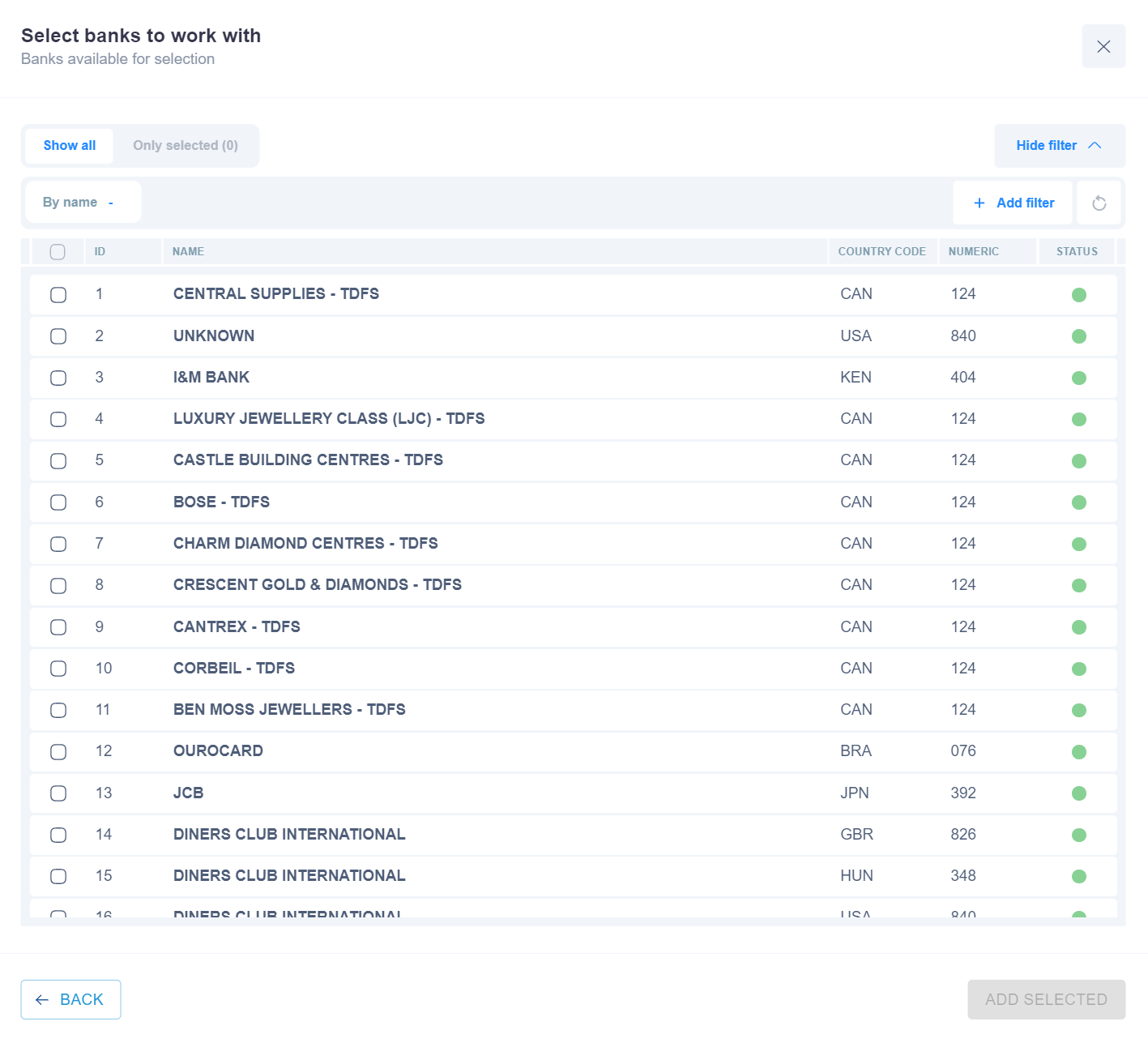 3) The Destination Card Bank routing type allows to sort transactions by the receiver’s Issuer Bank name. Select the needed Issuer Bank names of the receiver and build a further route based on them. There is an option to search Banks by their names. System can search for up to 500 entered Bank names listed one after another and separated by commas. They can be chosen by pressing the “By name -” button.