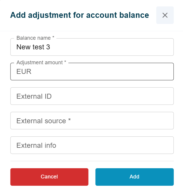 Adjustment amount and external source of the adjustment are mandatory. Adjustments for balance can be made via Add+ button: