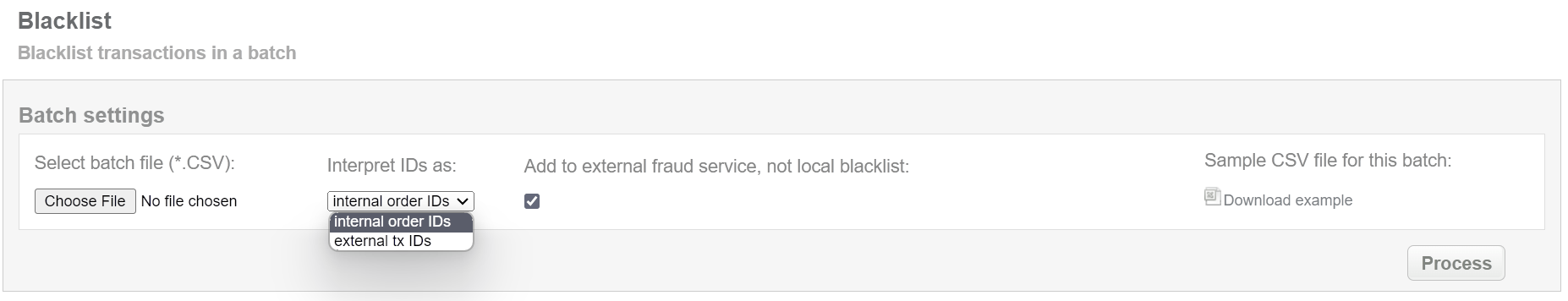 This batch operation, in according to specified input, puts cards in blacklist or external fraud system if such is set up. Collect the order IDs, assigned by Doc2.0 system to the CSV file and upload it to blacklist card of selected transactions. An example of CSV file for upload is available on the same screen.