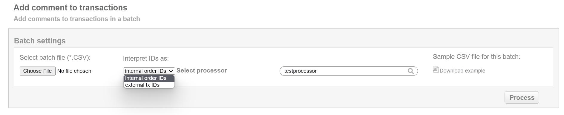 This batch operation can be useful for adding a or an additional comment to transactions in according to specified input. Collect the order IDs, assigned by Doc2.0 system to the CSV file and upload it to add comment for the selected transactions. An example of CSV file for upload is available on the same screen.