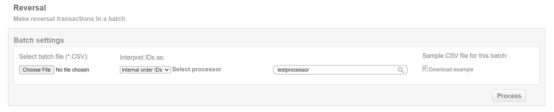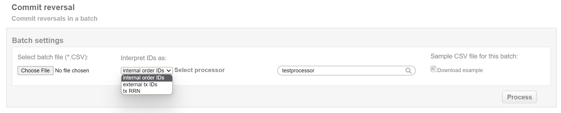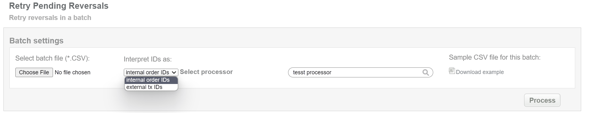 This batch operation re-sends reversal request for pending reversals in according to specified input. Collect the order IDs, assigned by Doc2.0 system to the CSV file and upload it to make reversal of selected transactions. An example of CSV file for upload is available on the same screen.