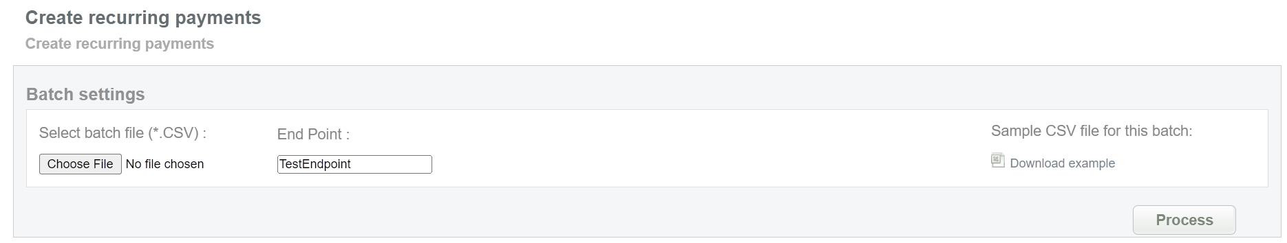 This batch operation can be useful for initiating recurring payments for transactions that require regular debits with the same data. Collect the order IDs, assigned by Doc2.0 system and enter all information to the CSV file and upload it to create recurring payments. An example of CSV file for upload is available on the same screen.