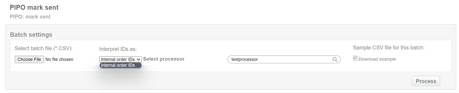 This batch operation allows to mark pending bank transfer as sent (but not received yet). This status equals to “processing” for preauth transaction. Collect order IDs, assigned by Doc2.0 system and enter all information to the CSV file and upload it to mark PIPO payments as sent. An example of CSV file for upload is available on the same screen.