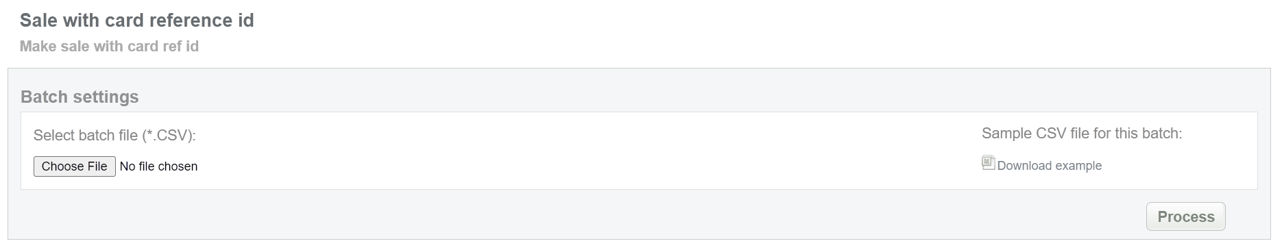 This batch operation can be useful for initiating sale without any card information using only card reference ID. Collect the Endpoint and Card reference IDs, assigned by Doc2.0 system and enter all information to the CSV file and upload it to initiate sale transactions with card reference ID. An example of CSV file for upload is available on the same screen.