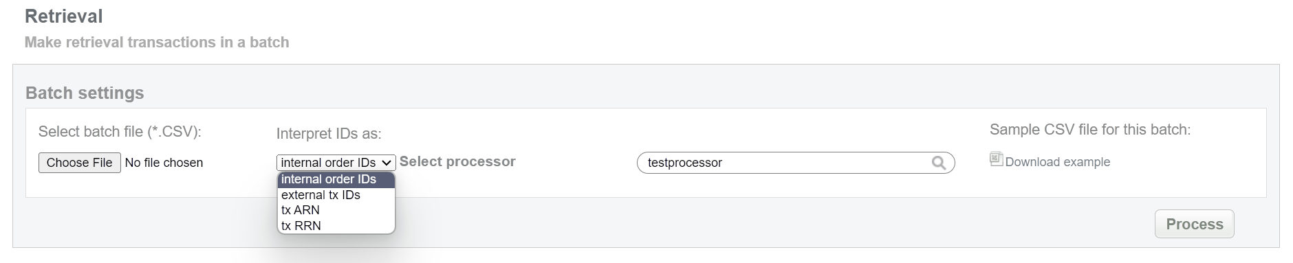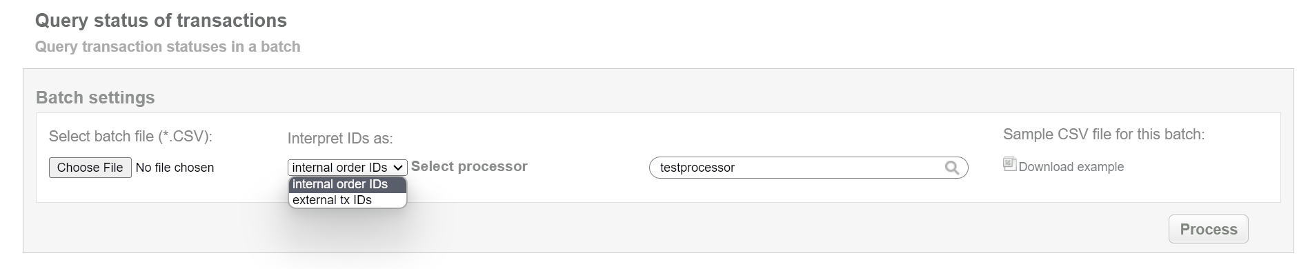 This batch allows to mark pending bank transfer as received. This status equals to “approved” for preauth transaction. Collect order IDs, assigned by Doc2.0 system and enter all information to the CSV file and upload it to mark PIPO payments as received. An example of CSV file for upload is available on the same screen.
