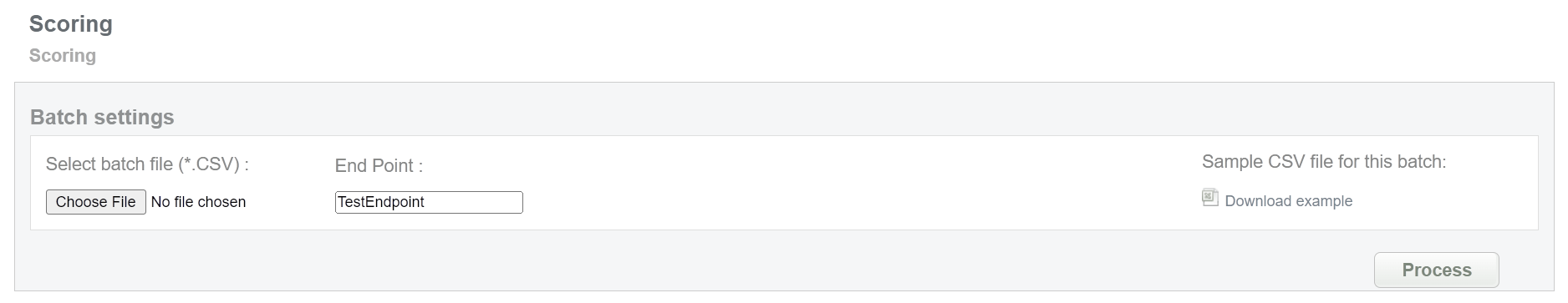 This batch allows to get information about card scoring. Collect order IDs and needed card data, assigned by Doc2.0 system and enter all information to the CSV file and upload it to receive card scoring information. An example of CSV file for upload is available on the same screen.