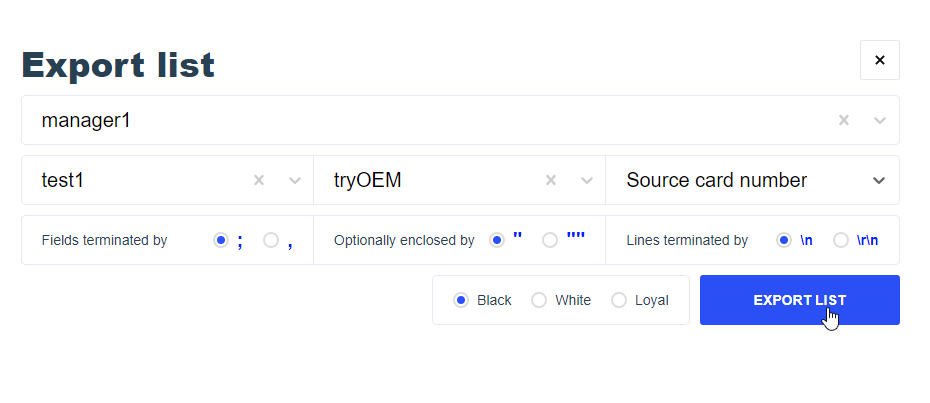 For example, in order to add card number to list, the following order should be used for every line: (5555514066237247,12,2019) with ‘,’ delimiter between lines.