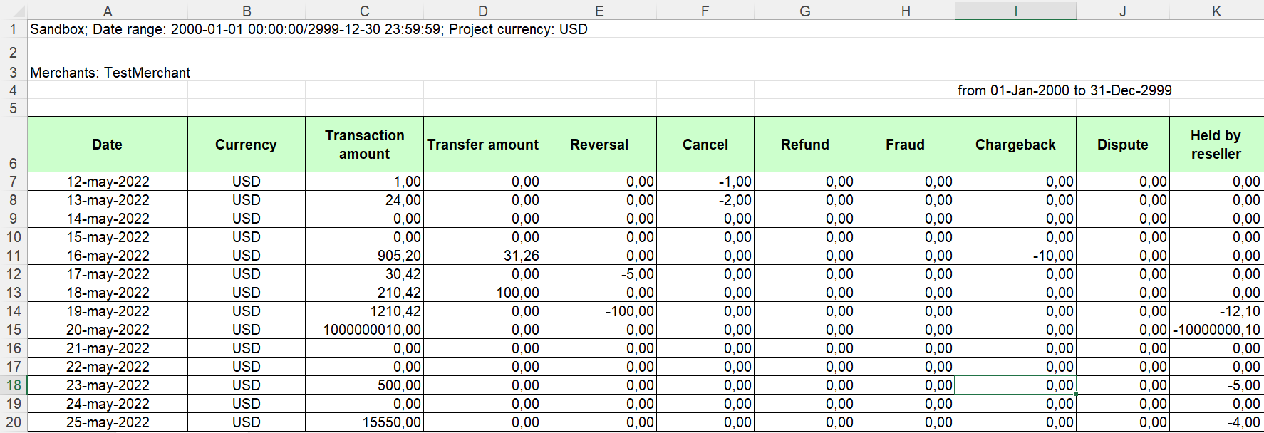 В этом отчете рассчитываются обороты по транзакциям: продажа, чарджбэк (возвратный платёж) и возврат средств. Показывается распределение оборота с комиссиями и примерная прибыль за выбранный период, а также ежедневная прибыль. Для загрузки необходимых данных используются следующие критерии: даты, проект, валюты.