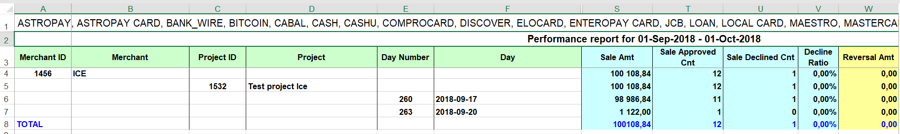 В этом отчете отображается финансовый поток за указанный период. Он также позволяет просматривать количество успешных и неуспешных транзакций. Гибкая настройка критериев позволяет получить необходимые данные: диапазон и тип дат, валюты, типы карт, группировку данных. При необходимости можно добавить дополнительные критерии, нажав на кнопку Критерии: терминалы и проекты.