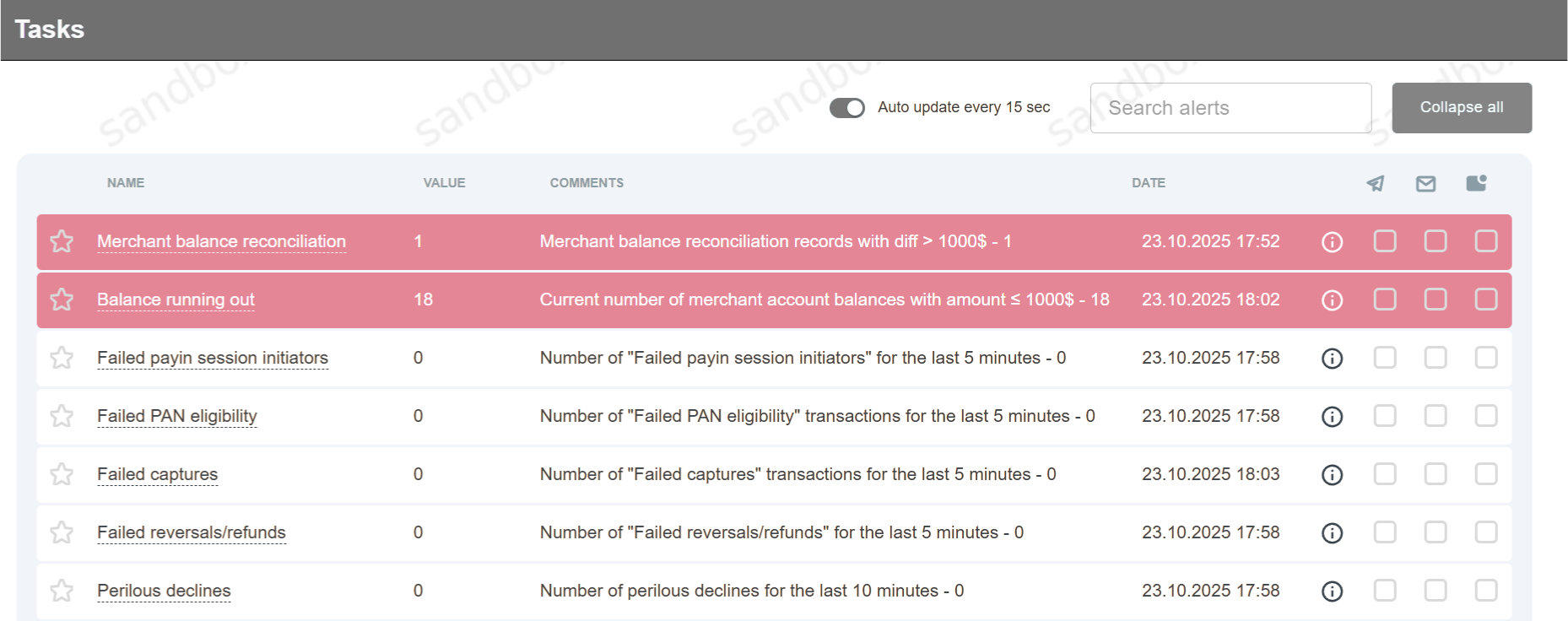 Экран Онлайн-мониторинга находится в разделе “Инструменты” — “Мониторинг”. Здесь отображается информация о различных ошибках, требующих незамедлительного реагирования. Также присутствует возможность подписки на уведомления о любых ошибках через Telegram, электронную почту или Push-уведомления.
