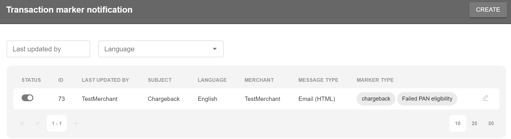The main screen displays a list of all notifications, their status, ID, subject, language, merchant name, message type and marker type.