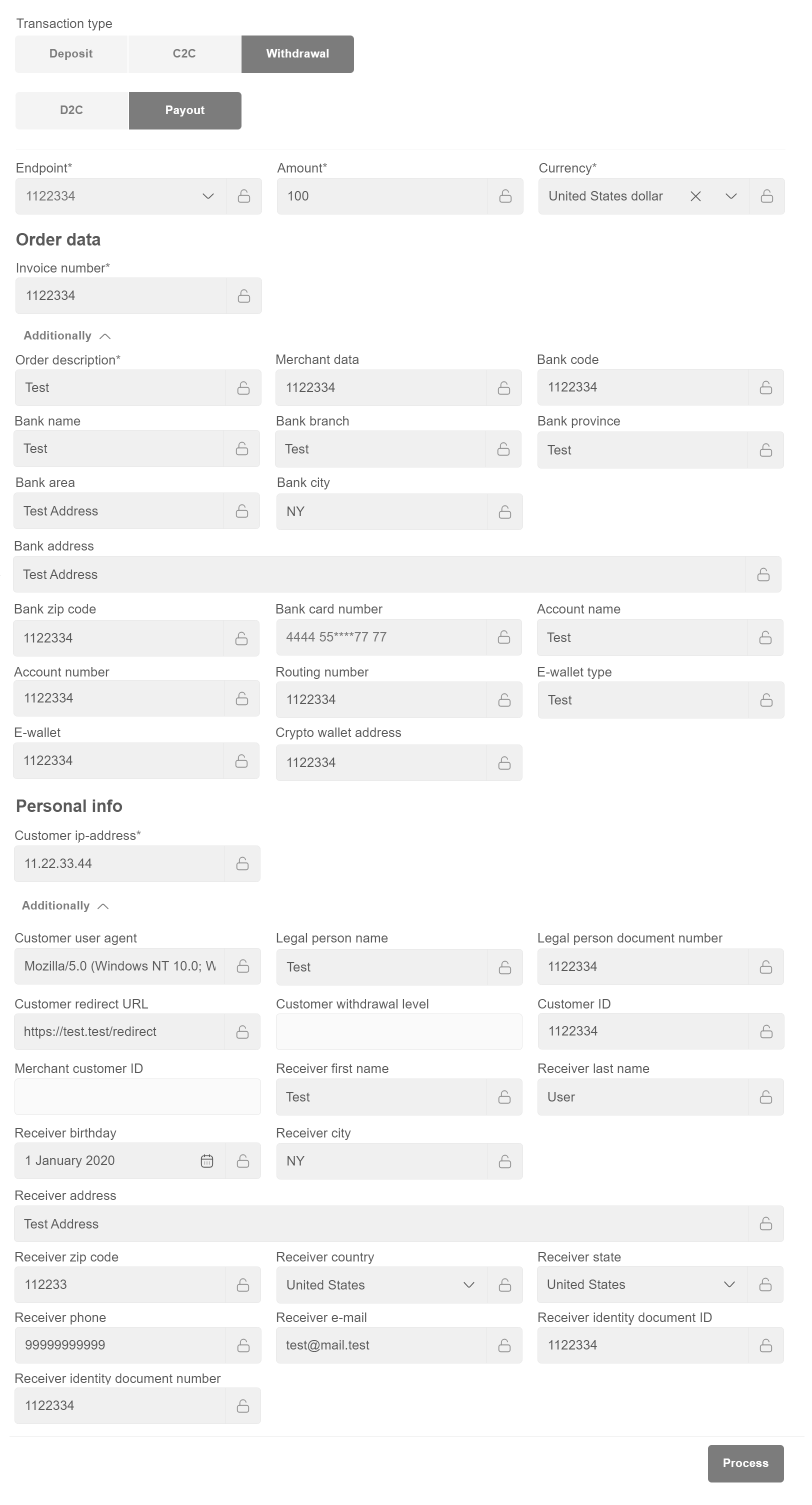The Merchant fills the cardholder data or use recurring IDs for both sender and receiver of funds directly on VT and initiates transfer processing with “Process” button. In this case the transaction must be processed through the non3D channel, which is not common for C2C transfers.