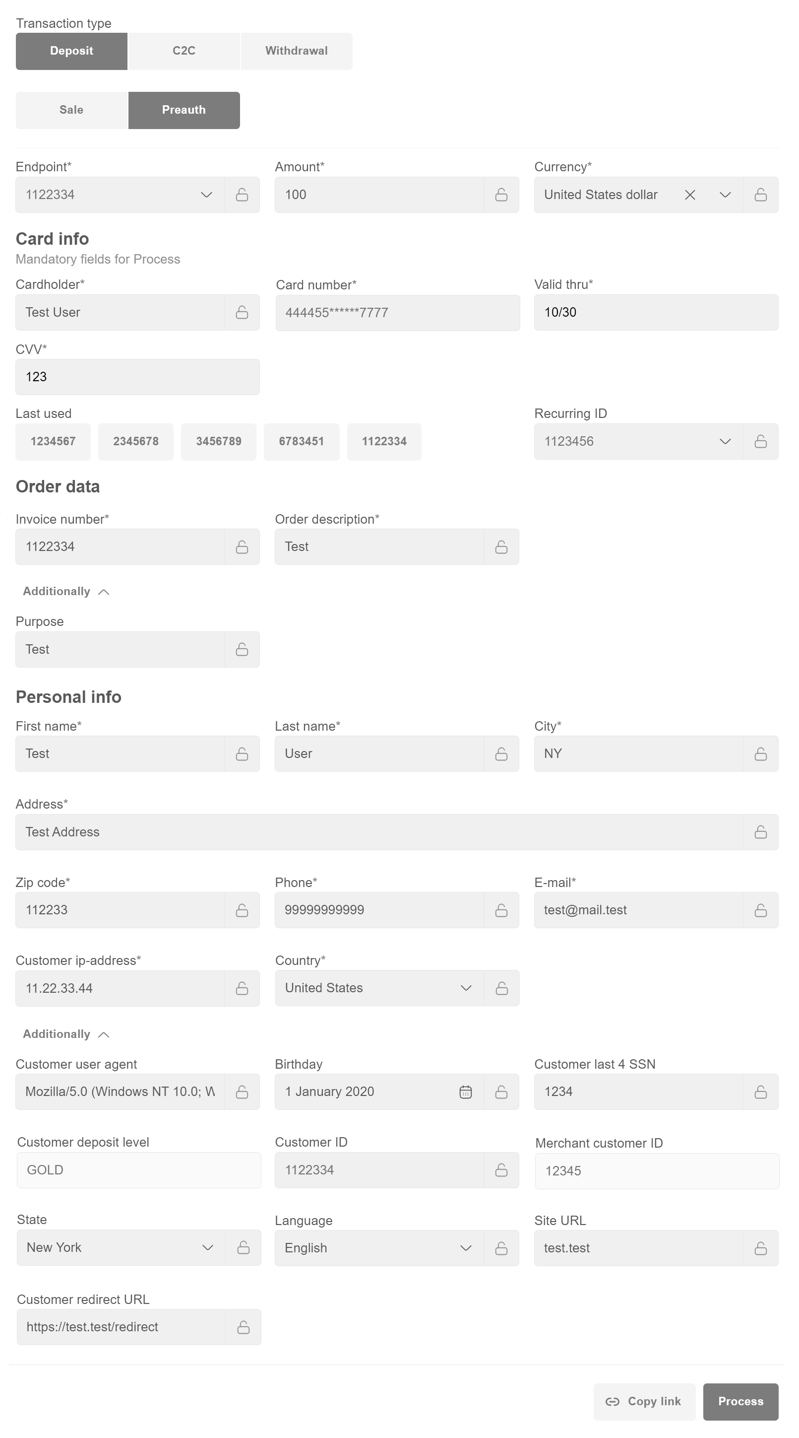 - can be filled automatically together with Personal info, if Recurring ID is provided. If Recurring ID is provided and CVV field is empty, use “Copy link” to provide form to customer for additional confirmation. In case if it will be filled in VT form directly then transaction will be processed directly.